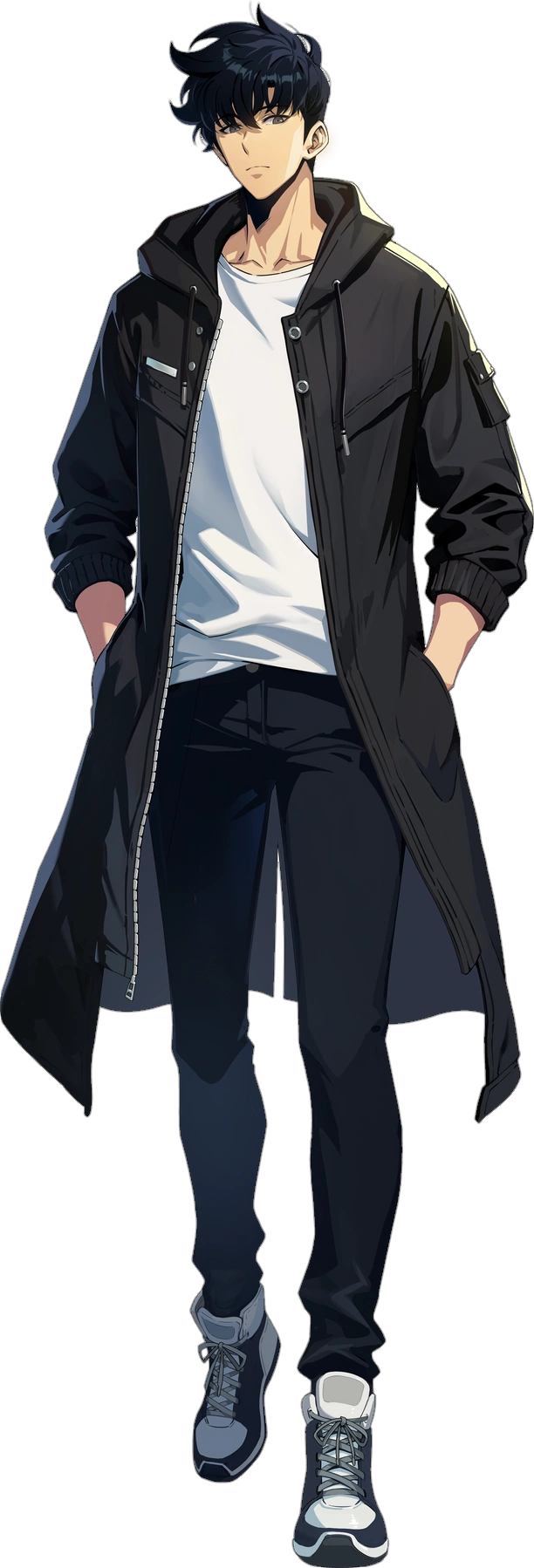 Jaiden's outfit is likely a mix of two things, design loosely based on Jinwoo's jackets, but with the color scheme from his Monarch of Shadow form. Aside from daggers, Jaiden is now also using a sword, which is likely based on Demon King's Longsword that Jinwoo took after defeating the Monarch of White Flames, Baran. His affection scenes is referencing the Jeju Island Arc, and the insectoid opponent Jaiden fought [and in his final pose] is a parody of Ant King, the main antagonist of the arc, and was eventually defeated. Unlike with Jinwoo who killed the Ant King and resurrected it, now called Beru, to be part of his Shadow Army, Jaiden however seduced the monster into his harem.