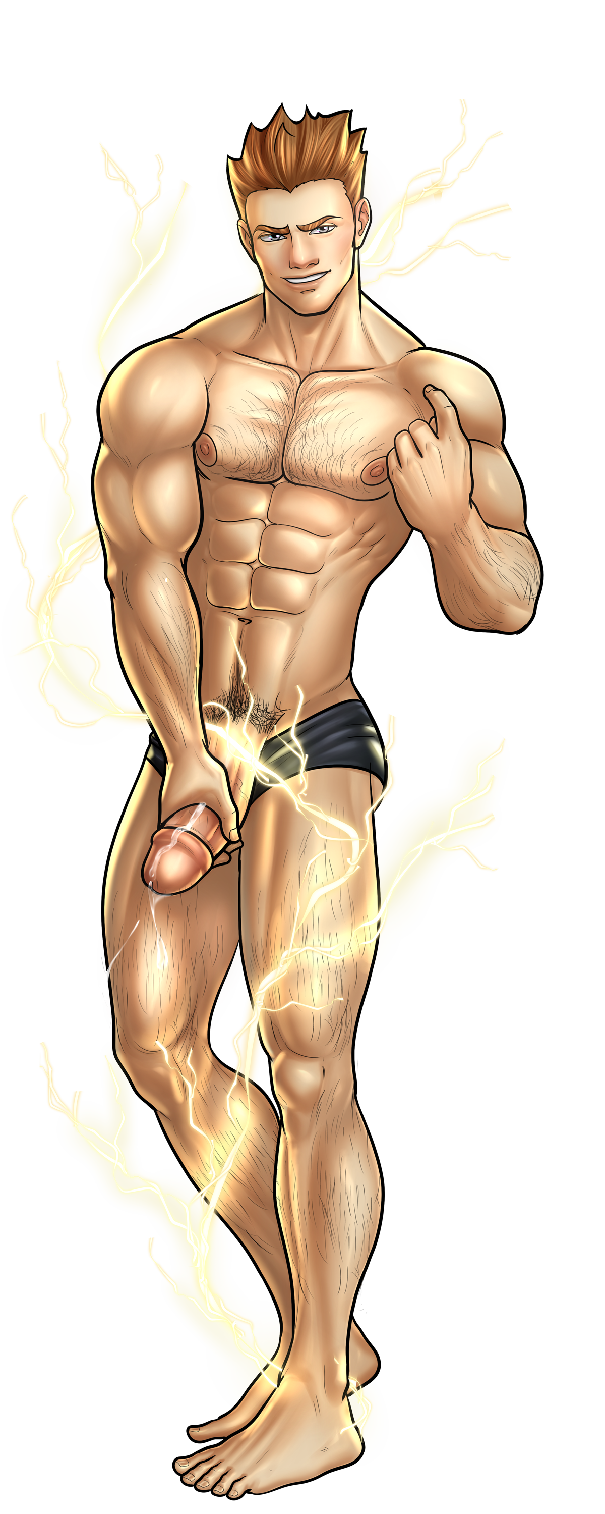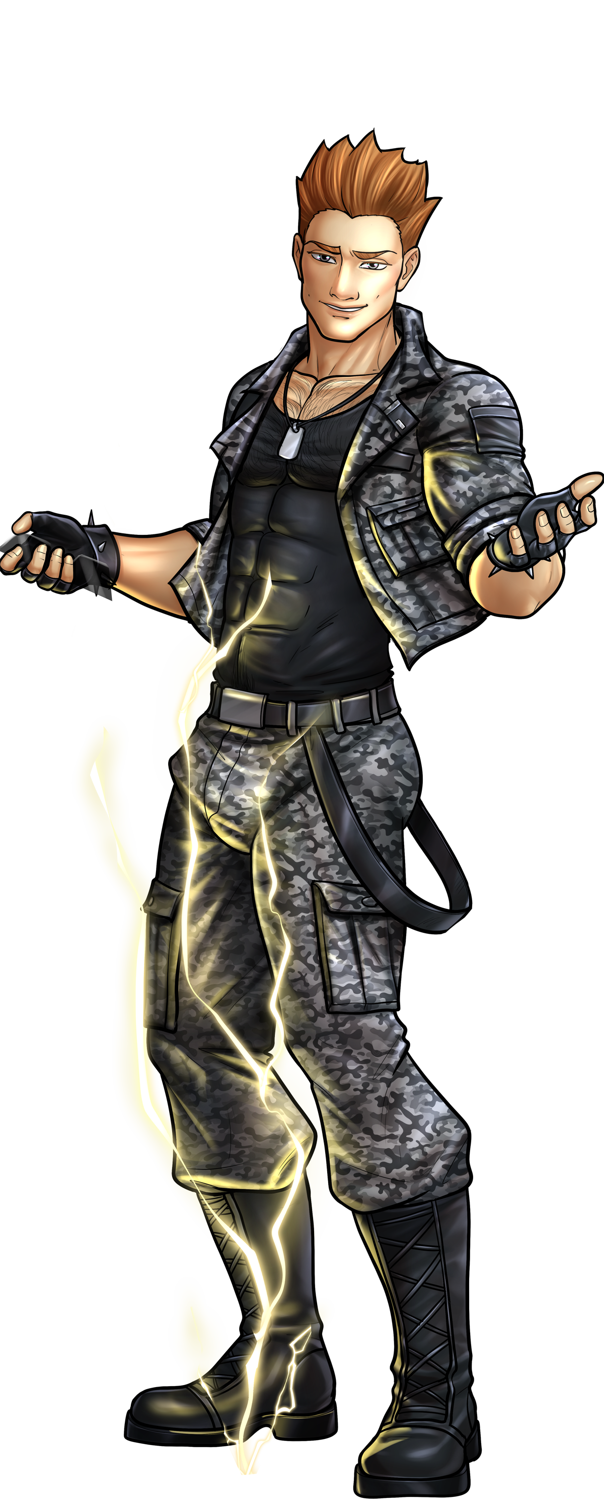 About: Lt. Volt is a fierce and stoic Spirimon trainer. A towering, boisterous former soldier, he earned the nickname “The Lightning Fucker” after teaming up with electric-type Spirimon in battle during his military service. Known for his tough-love attitude and explosive battlefield style, he values raw power and discipline. Despite his intimidating demeanor, he respects trainers who prove their courage, especially those who take on his signature partner, Cockchuu, and make him writhe in pleasure.